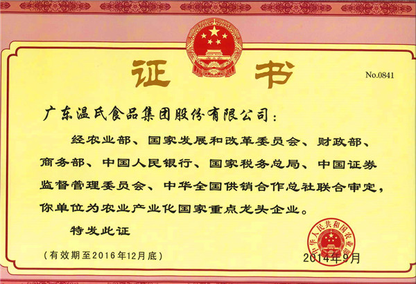 尊时凯龙集团通过国家第六次检测,,,,,继续享有农业工业化国家重点龙头企业称呼(有用期至2016年12月尾)